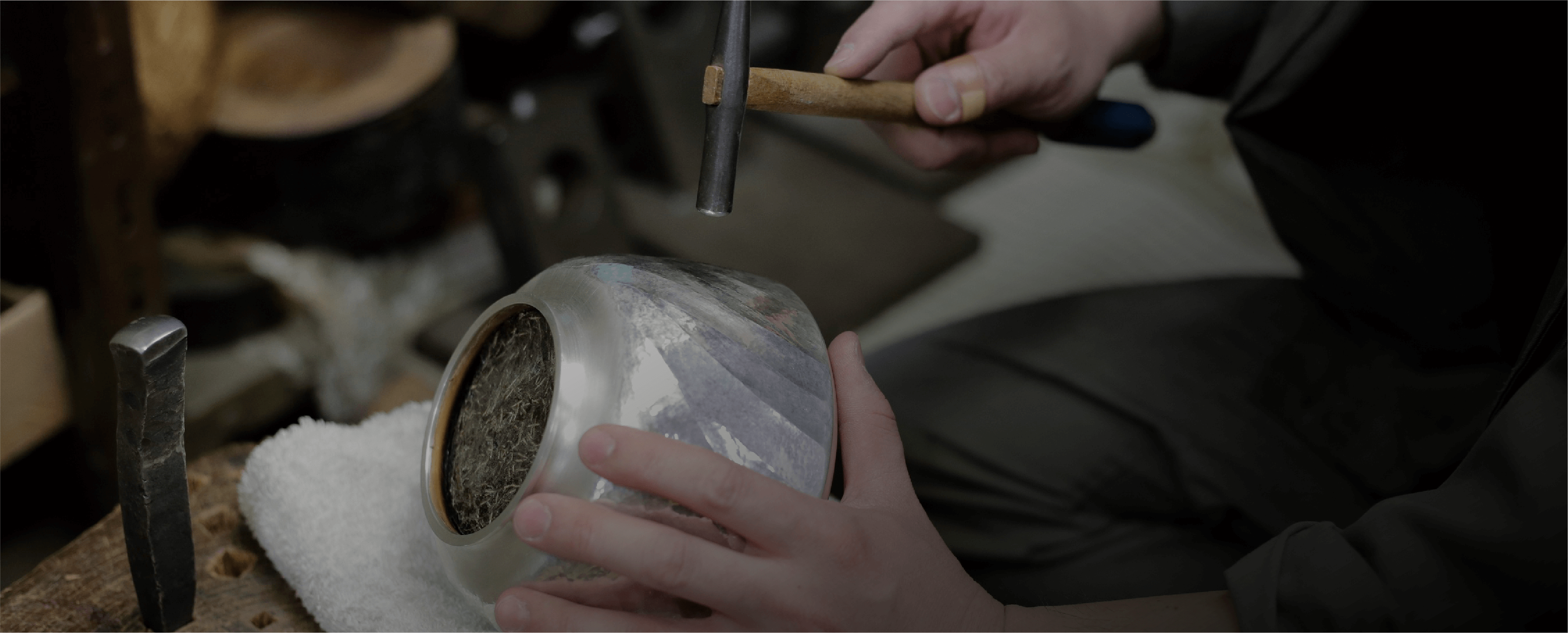 東京銀器の技術技法は鍛金師、彫金師、仕上師とよばれる職人たちによって受け継がれています。製造工程のほとんどは職人の手作業で行われ、「鍛金」、「彫金」、「切り嵌め(きりばめ)」、「鑞付け(ろうづけ)」の技法を駆使して、さまざまな製品を製造しています。